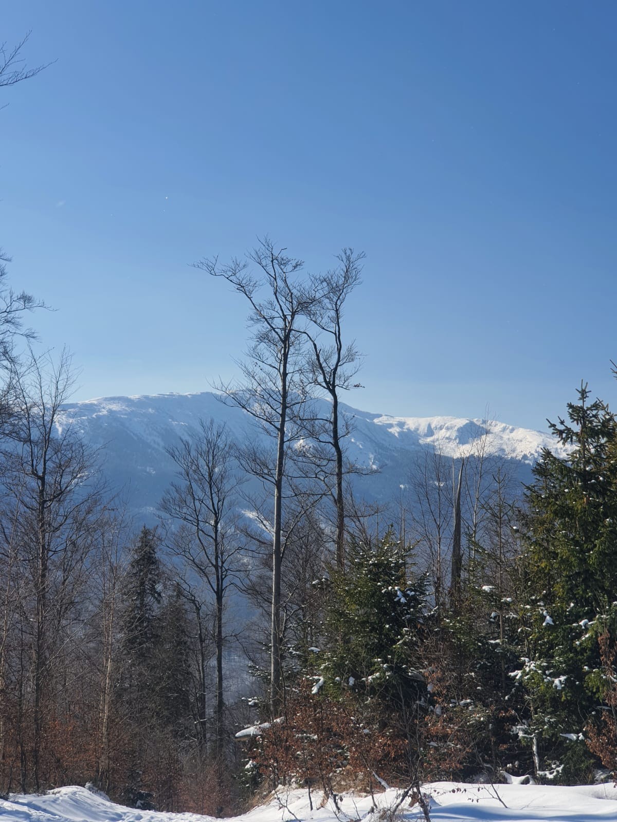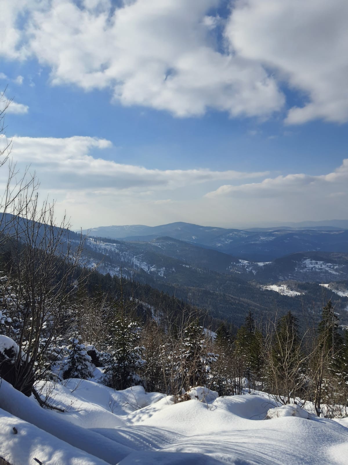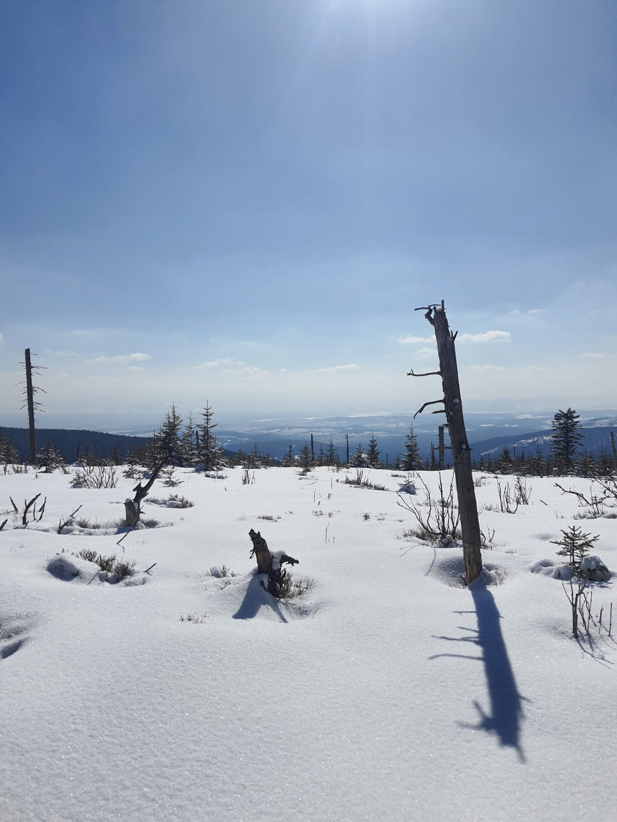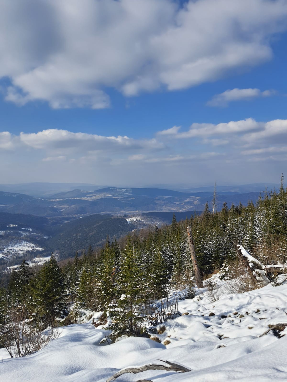 Gdy dotarliśmy na Mosorny Groń, zaskoczyła nas surowość temperatury. Termometr nie pozostawiał złudzeń, wskazując na -10 stopni Celsjusza. Chociaż krajobraz był ośnieżony i przykryty białym puchem, promienie słońca odbijały się od lodowatej powierzchni, tworząc błyszczące arcydzieło przyrody.