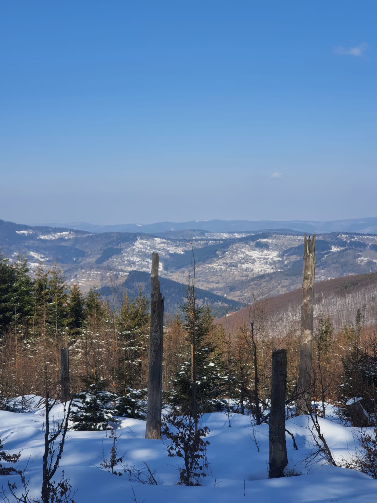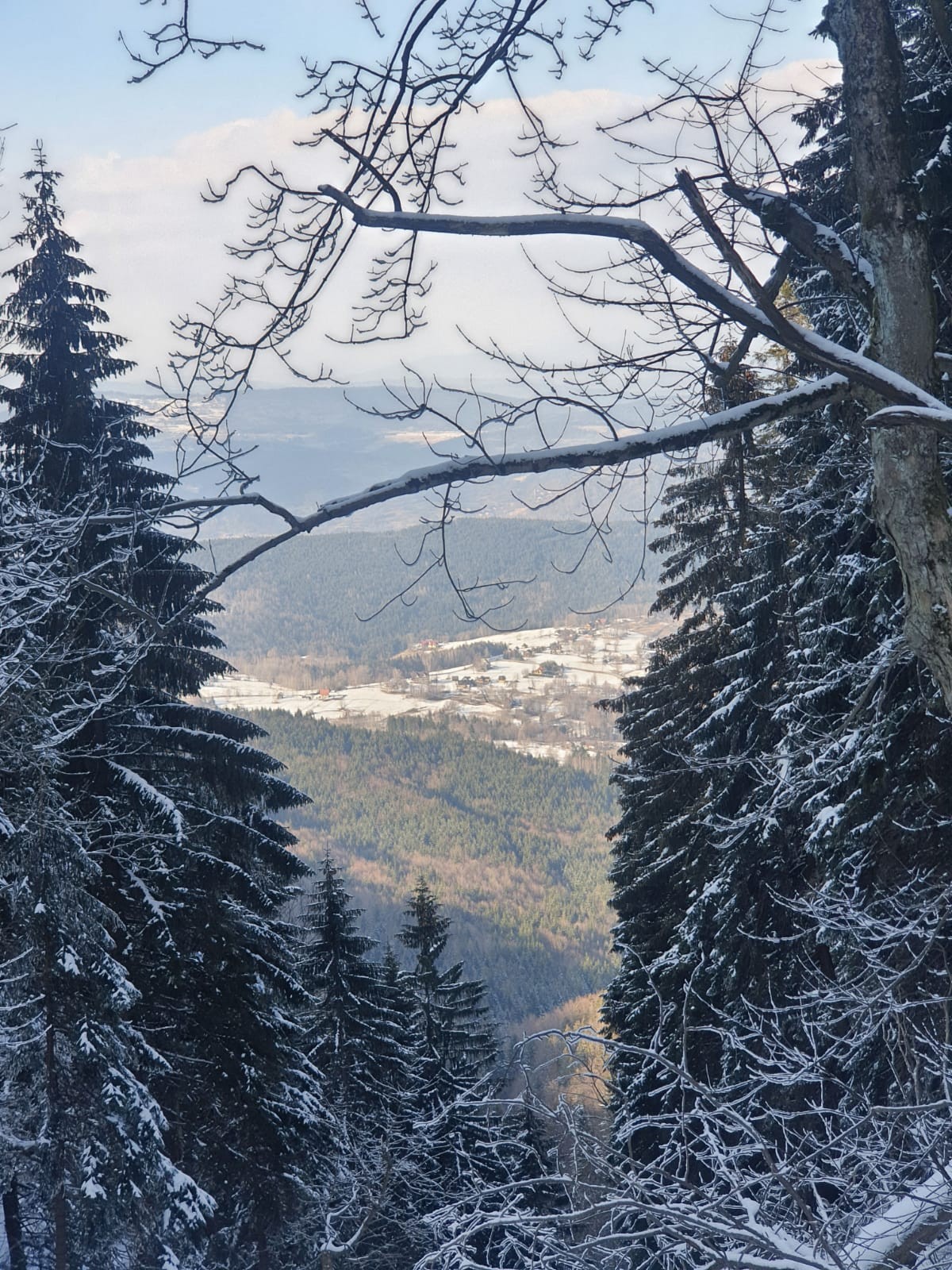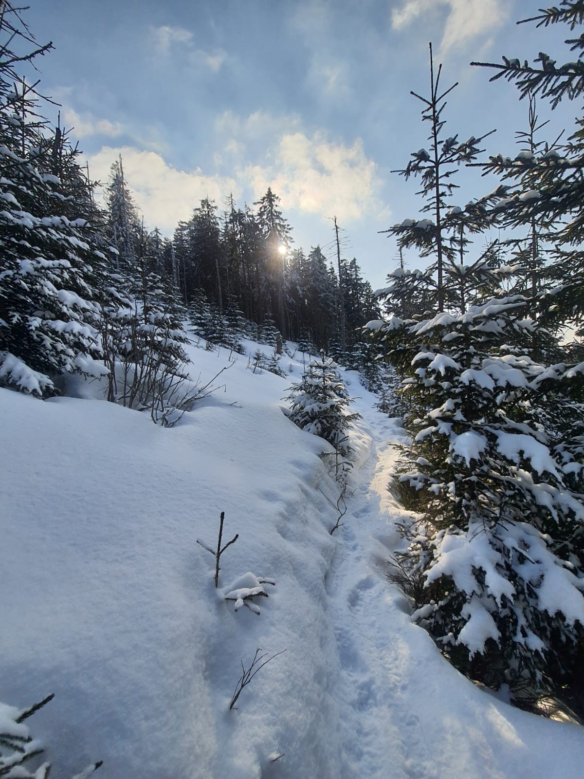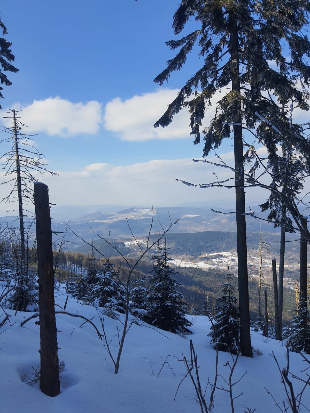 Gdy dotarliśmy na Mosorny Groń, zaskoczyła nas surowość temperatury. Termometr nie pozostawiał złudzeń, wskazując na -10 stopni Celsjusza. Chociaż krajobraz był ośnieżony i przykryty białym puchem, promienie słońca odbijały się od lodowatej powierzchni, tworząc błyszczące arcydzieło przyrody.